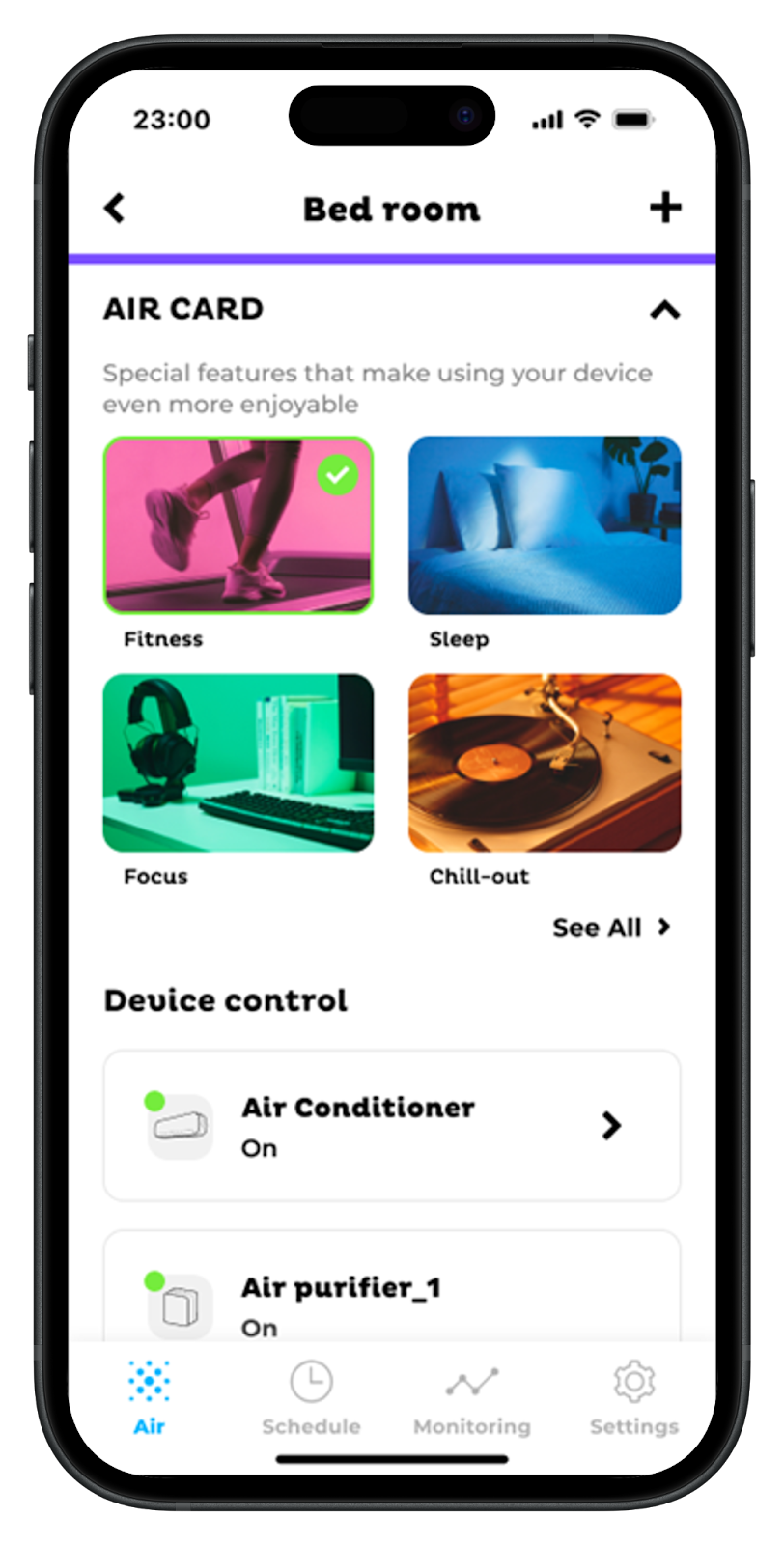 Điểm nổi bật của AIR CREATOR là khả năng tích hợp nhiều thiết bị trong cùng một hệ sinh thái thông qua AIR CARD. Dựa trên nhận định mỗi người có một “chuẩn thoải mái” khác nhau, người dùng có thể lựa chọn các chế độ phù hợp với từng bối cảnh sinh hoạt, và hệ thống sẽ tự động đồng bộ hoạt động giữa điều hòa và máy lọc không khí để tạo ra môi trường tối ưu, bao gồm: